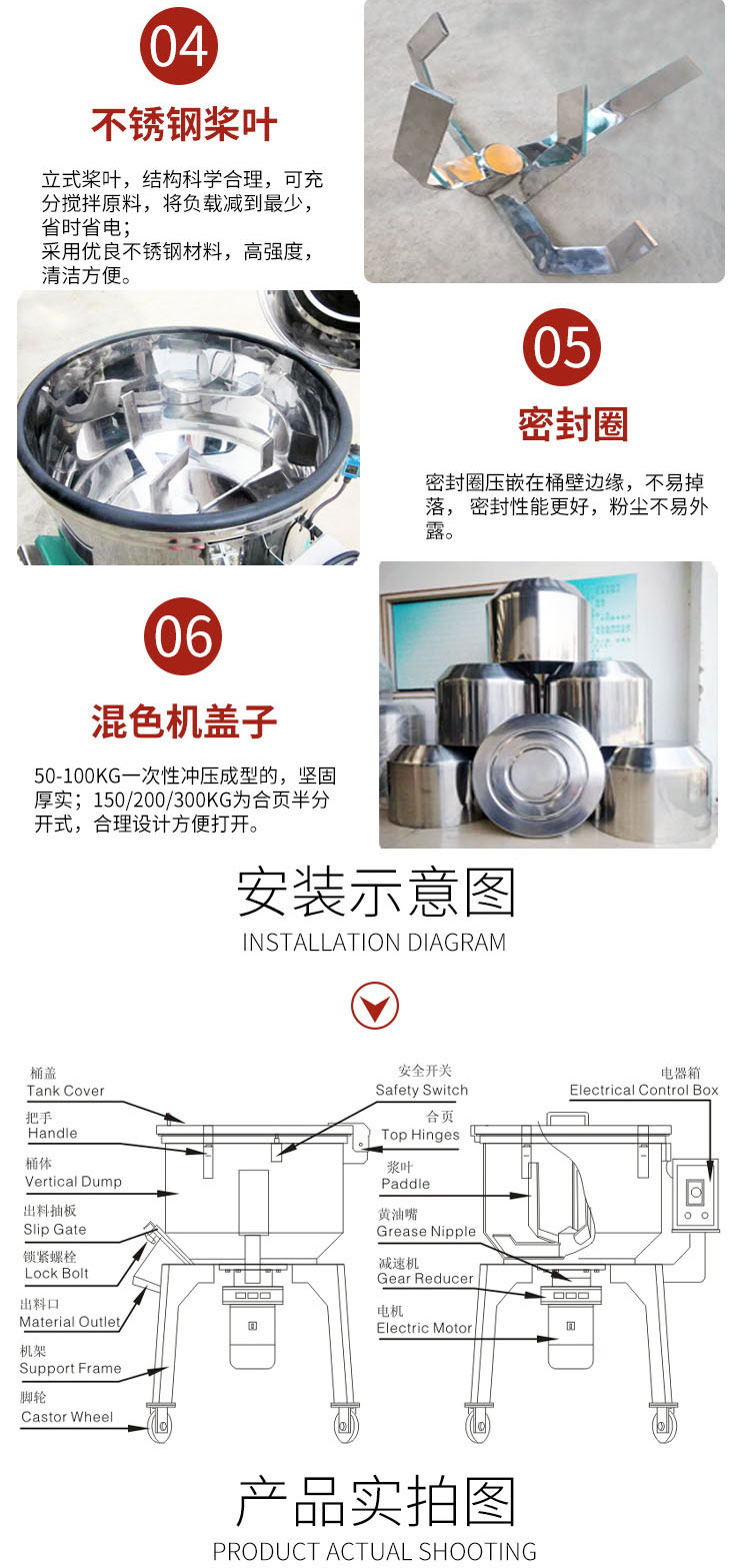 3、 短時(shí)間內(nèi)完成均勻混料、低耗能、高效率;